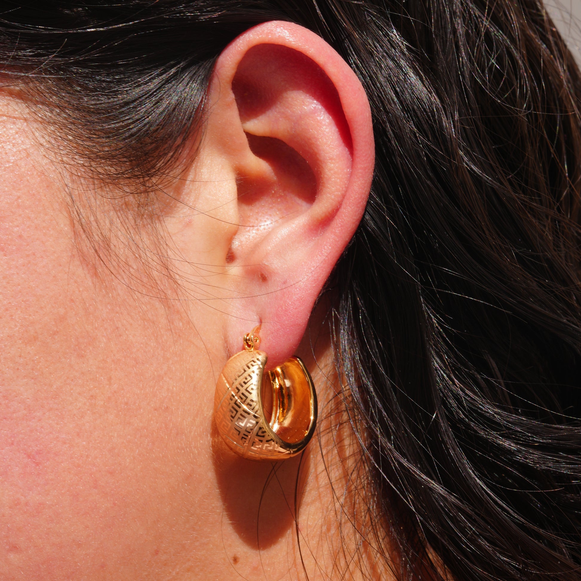 Aretes tipo argolla ancha con acabado pulido y grabado geométrico elegante.